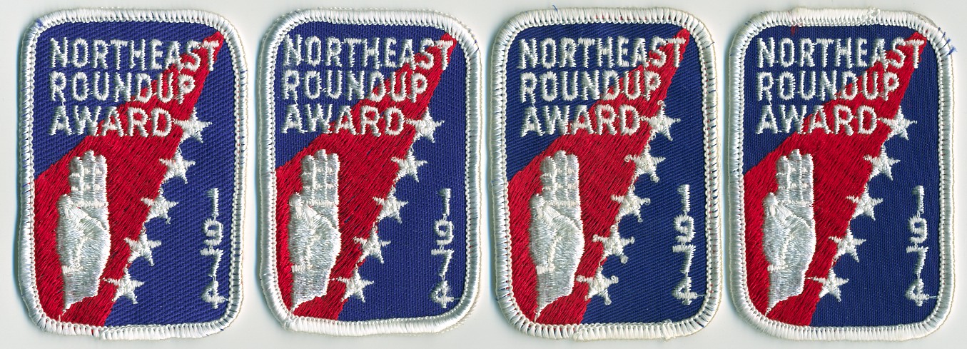 1974 Roundup Award | DBl | Wht | R | Wht | vrect | Hand in Scout sign; many twill and backing color variations | |