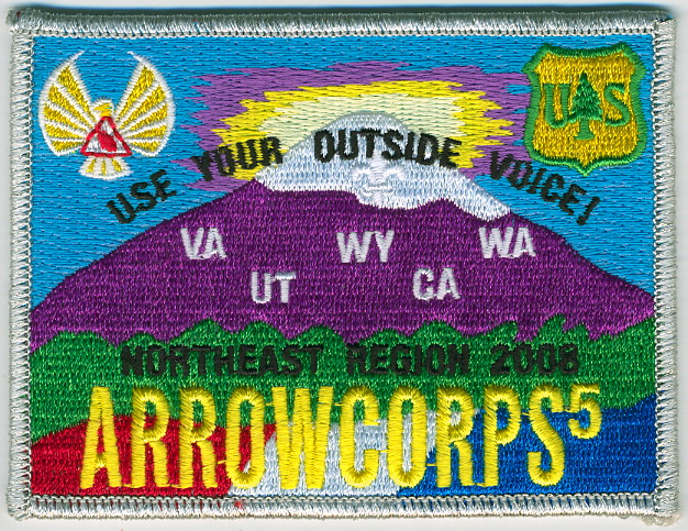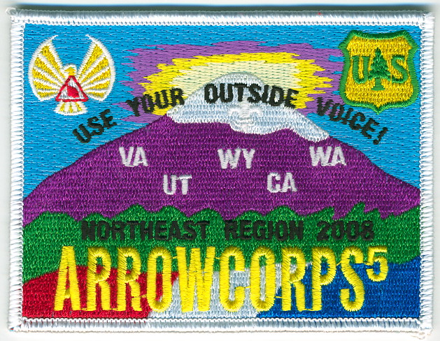 M/C | SMy | R | M/C | hrect | Wht | Snow-capped purple mountain; “Use Your Outside Voice!”; ArrowCorps5 2008; Region Chief’s issue |
