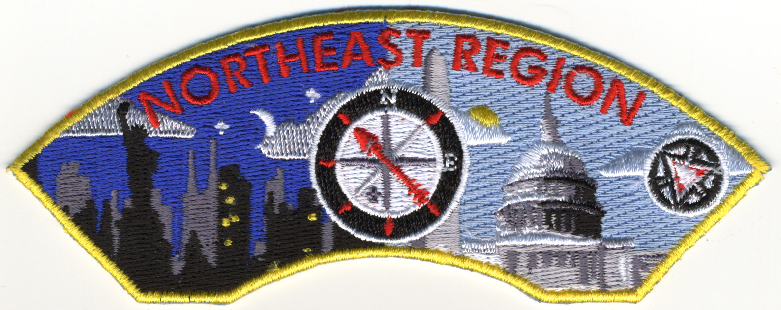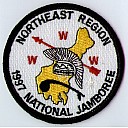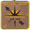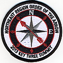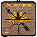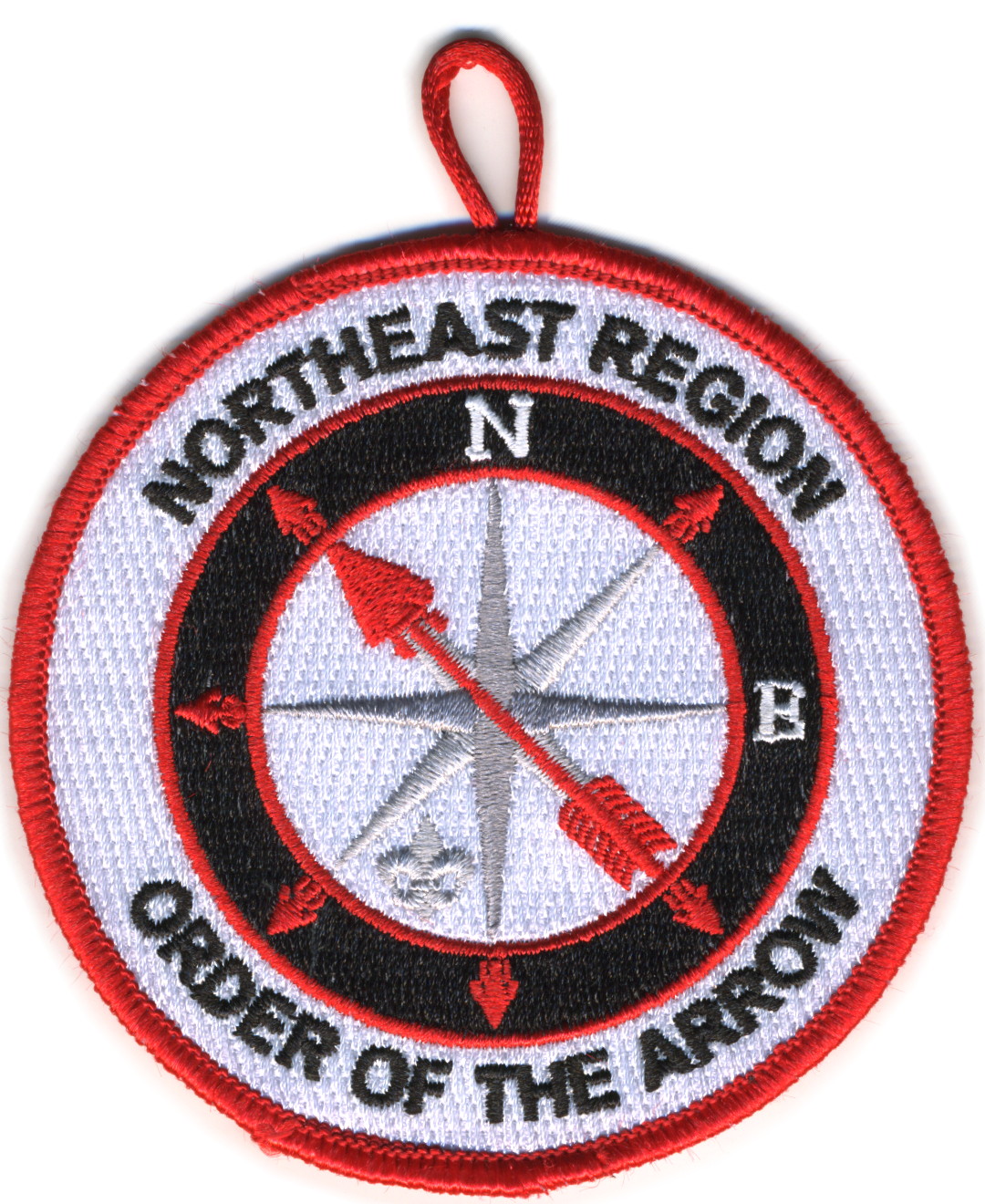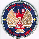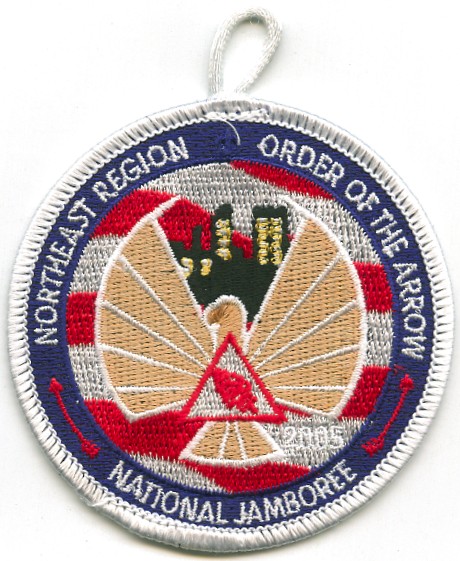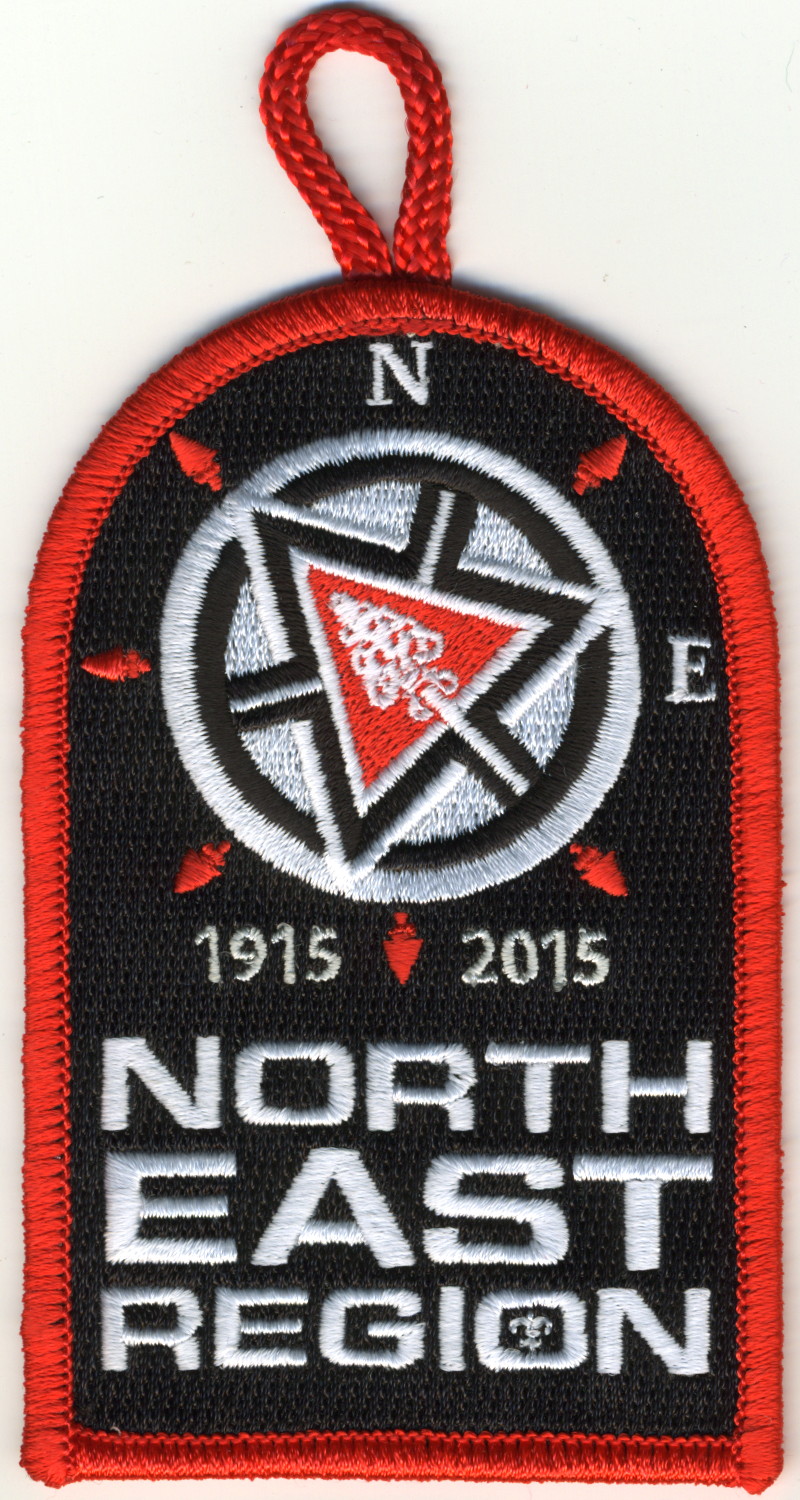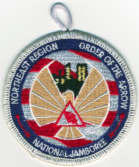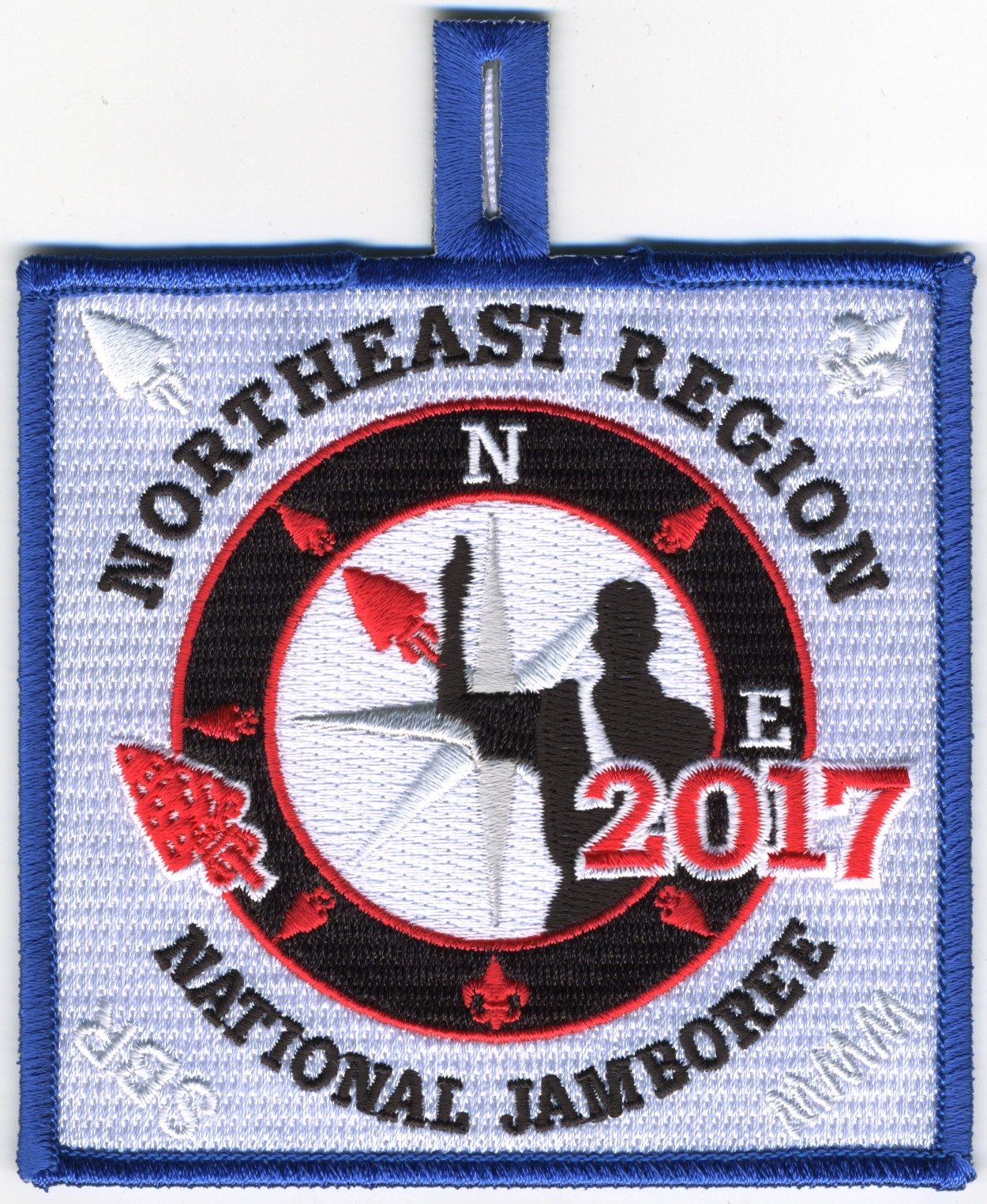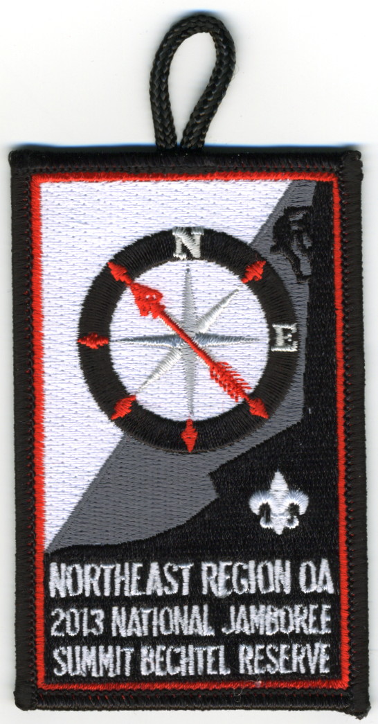 2017 Jamboree | Wht | Blu | R/C | Blk/LGy | square | LGy/Red | Compass rose, arrowman giving Scout sign; “Northeast Region”; button loop |