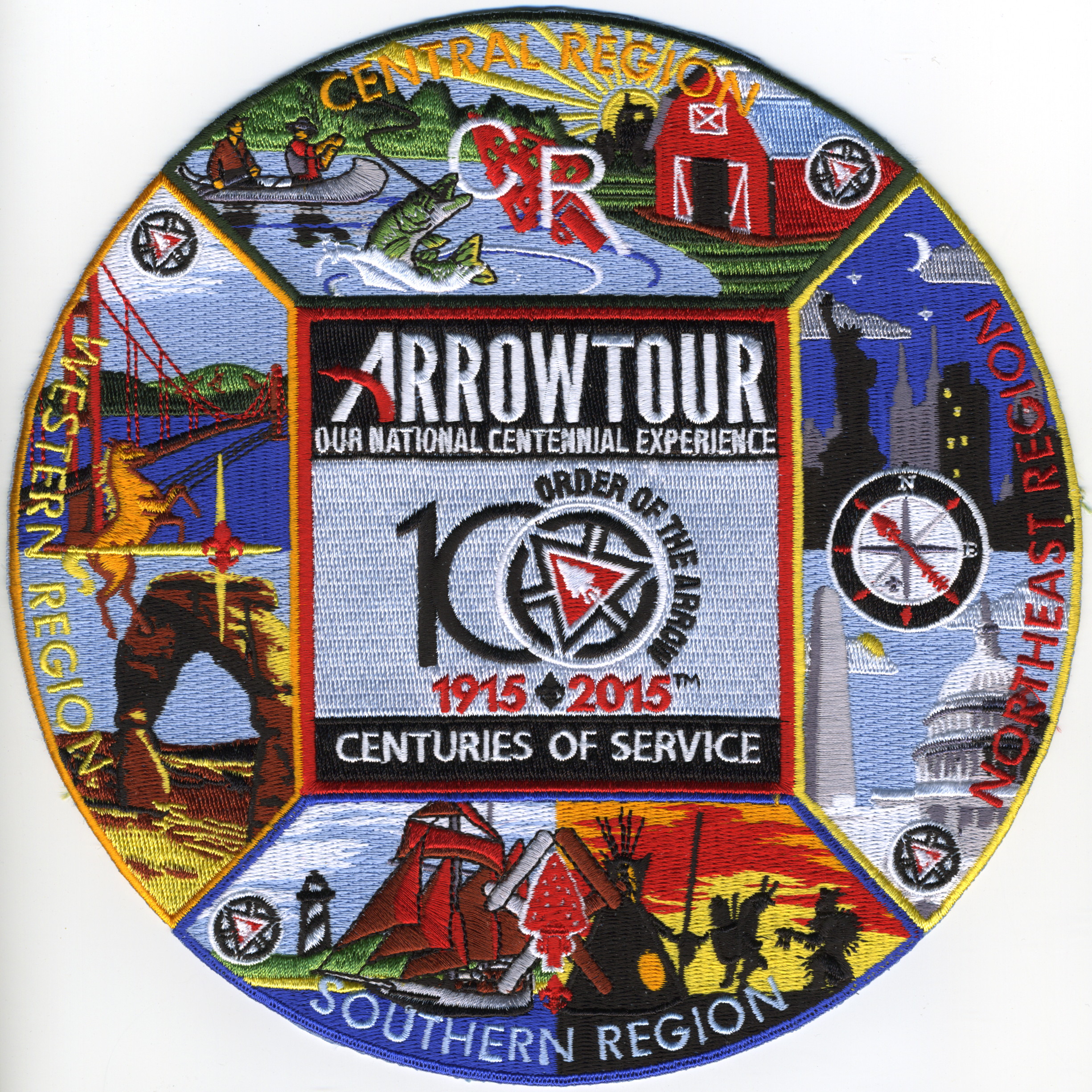 2015 ArrowTour Set | M/C | M/C | C | M/C | Round | Blk | Jacket patch; design of four regional segments around central patch; OA centennial totem |