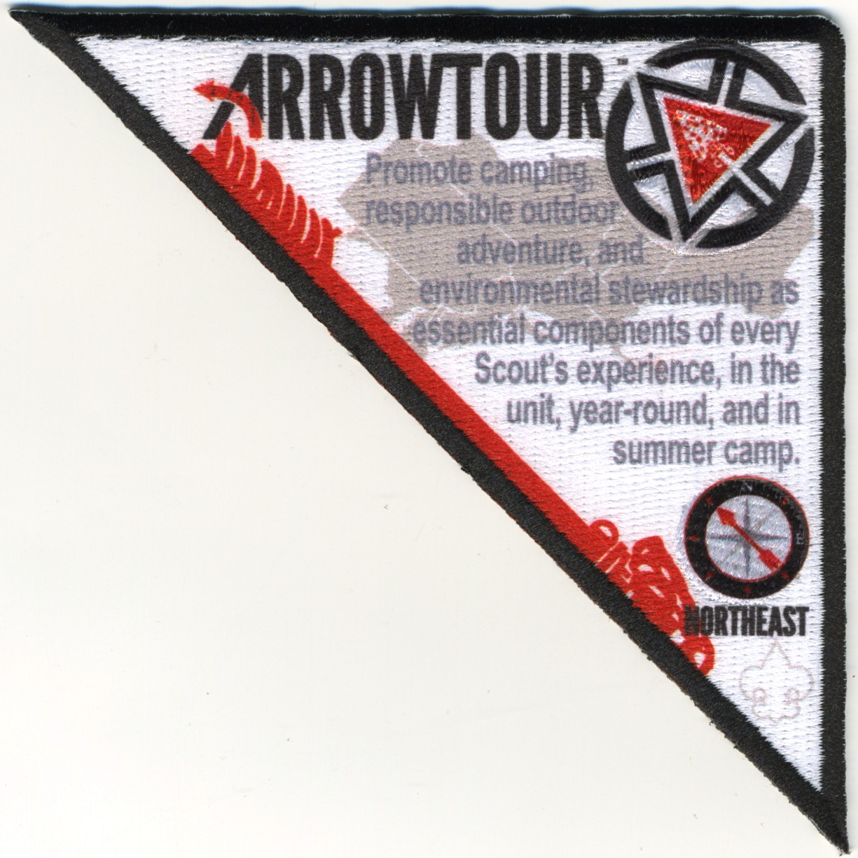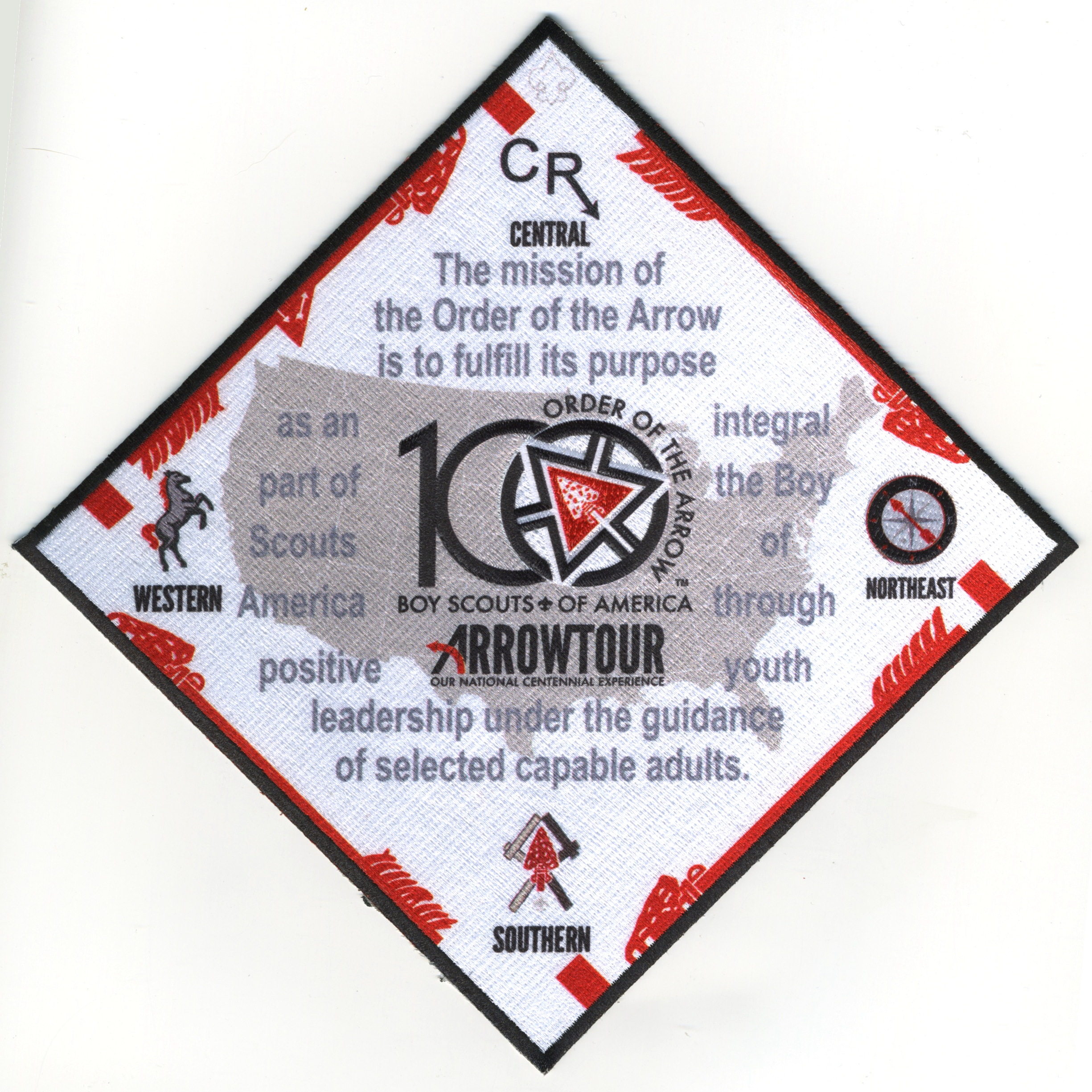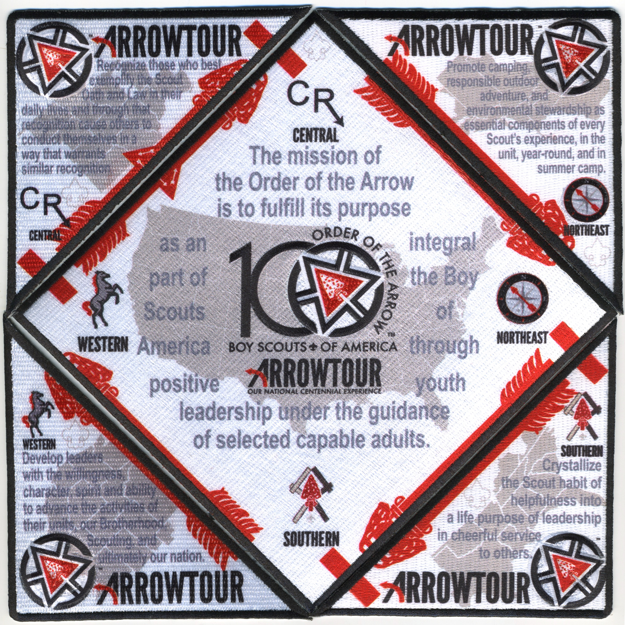 2015 ArrowTour | Wht | Blk | C | Blk/Gry | dmnd4 | Blk | Printed center patch; four region logos; OA centennial totem; fits four regional segments |