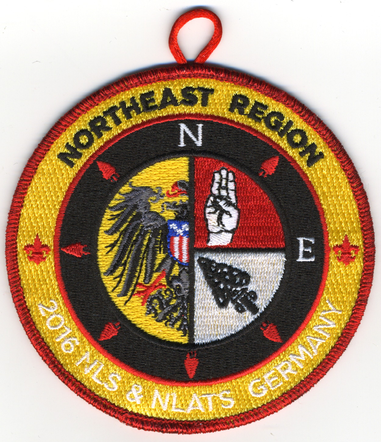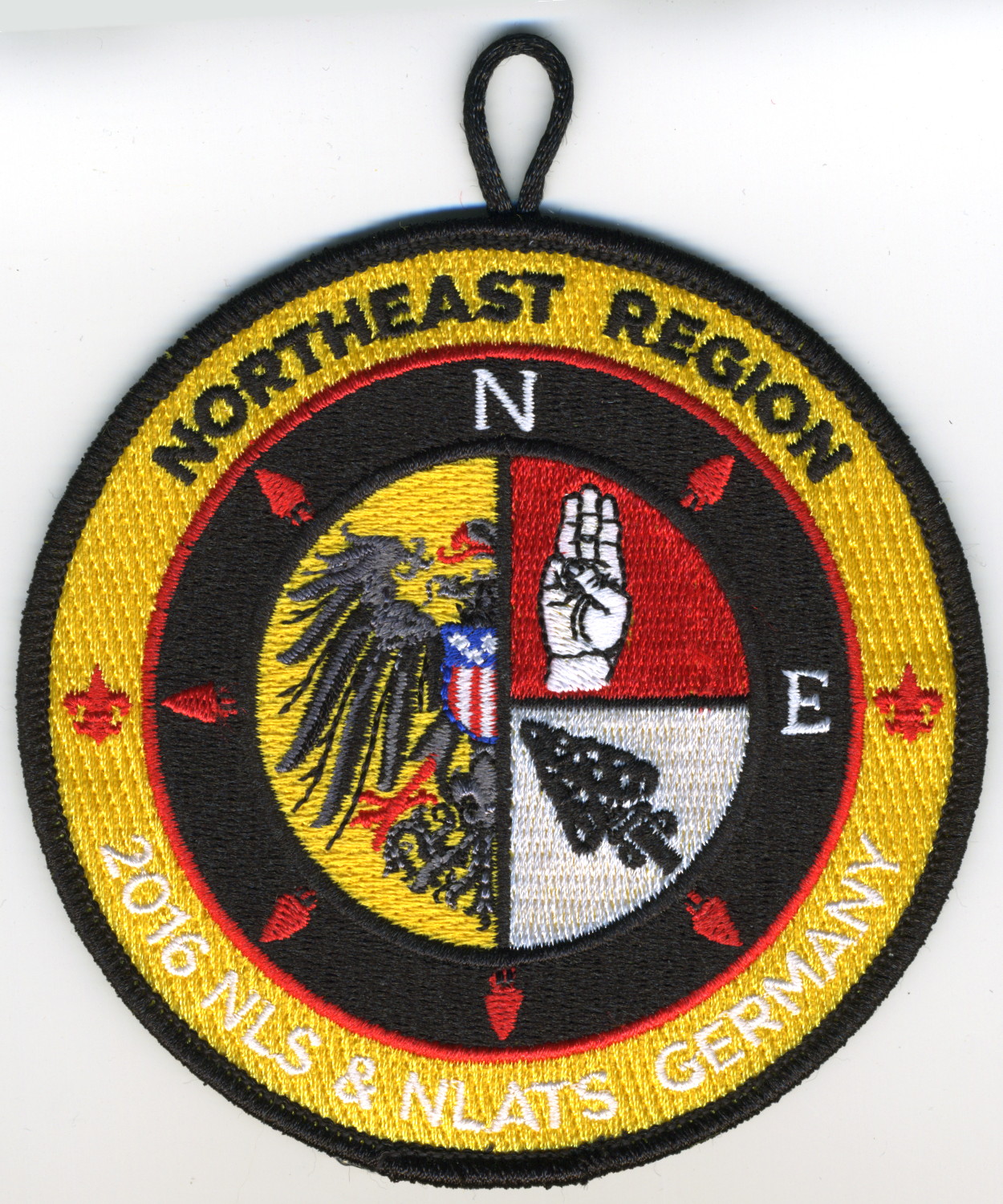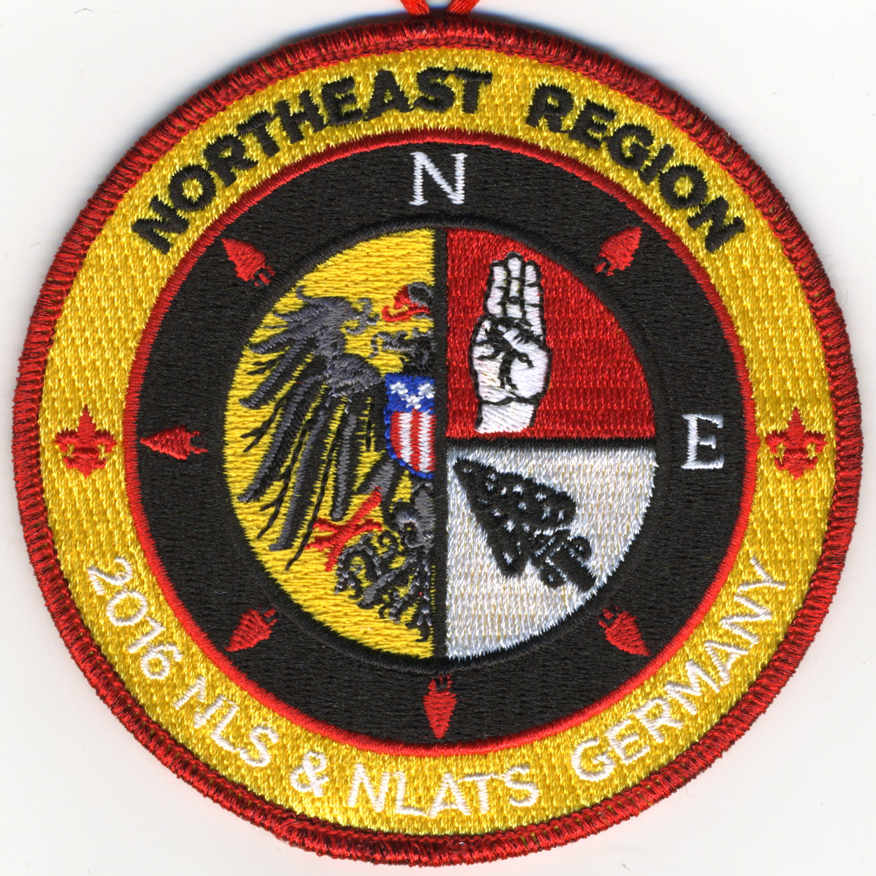 DYl | Blk | C | Blk/Wht | round | Red | Chenille fundraiser patch; compass rose surrounding Black Eagle, Scout sign, and arrowhead; “2016 NLS & NLATS Germany” |