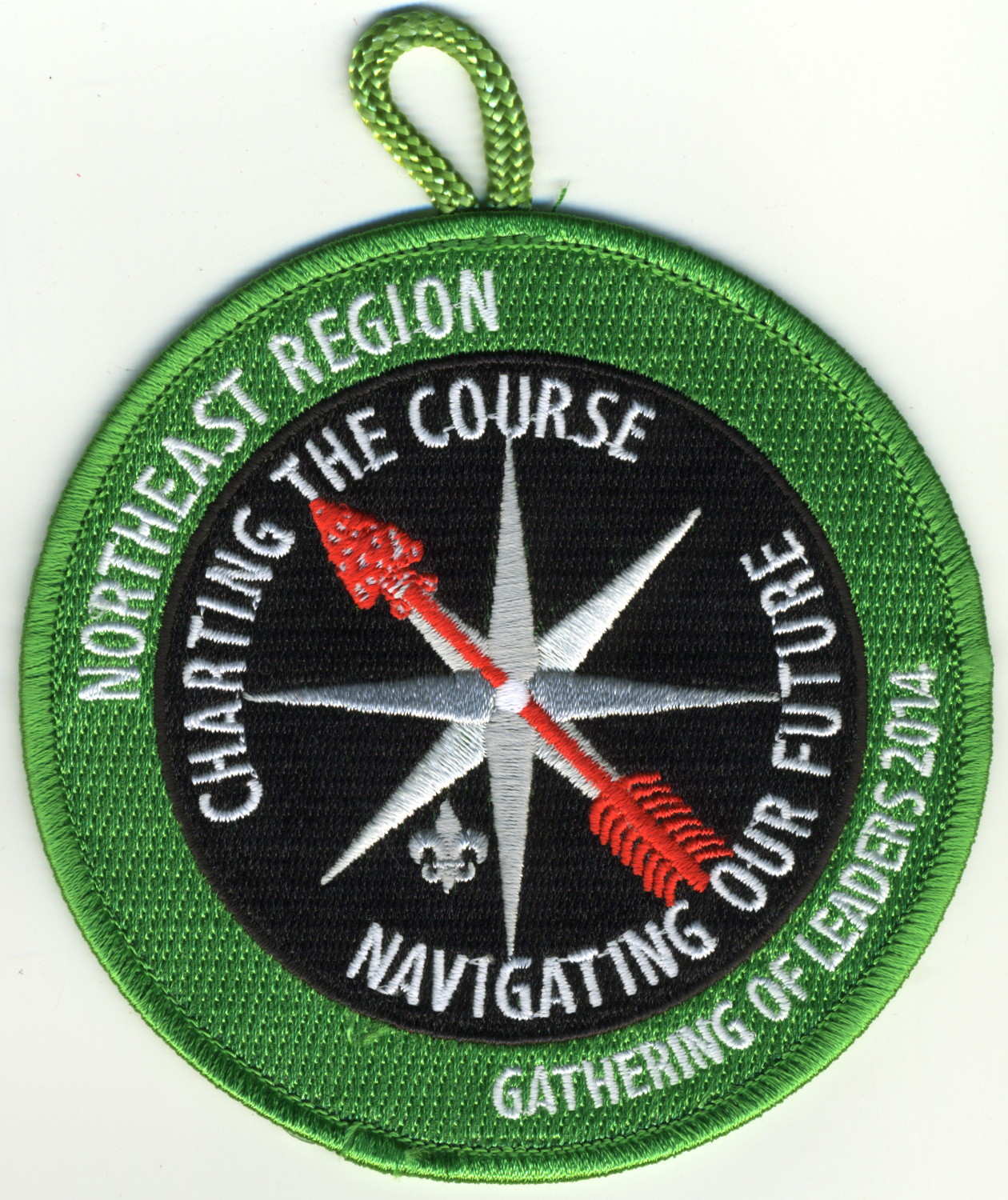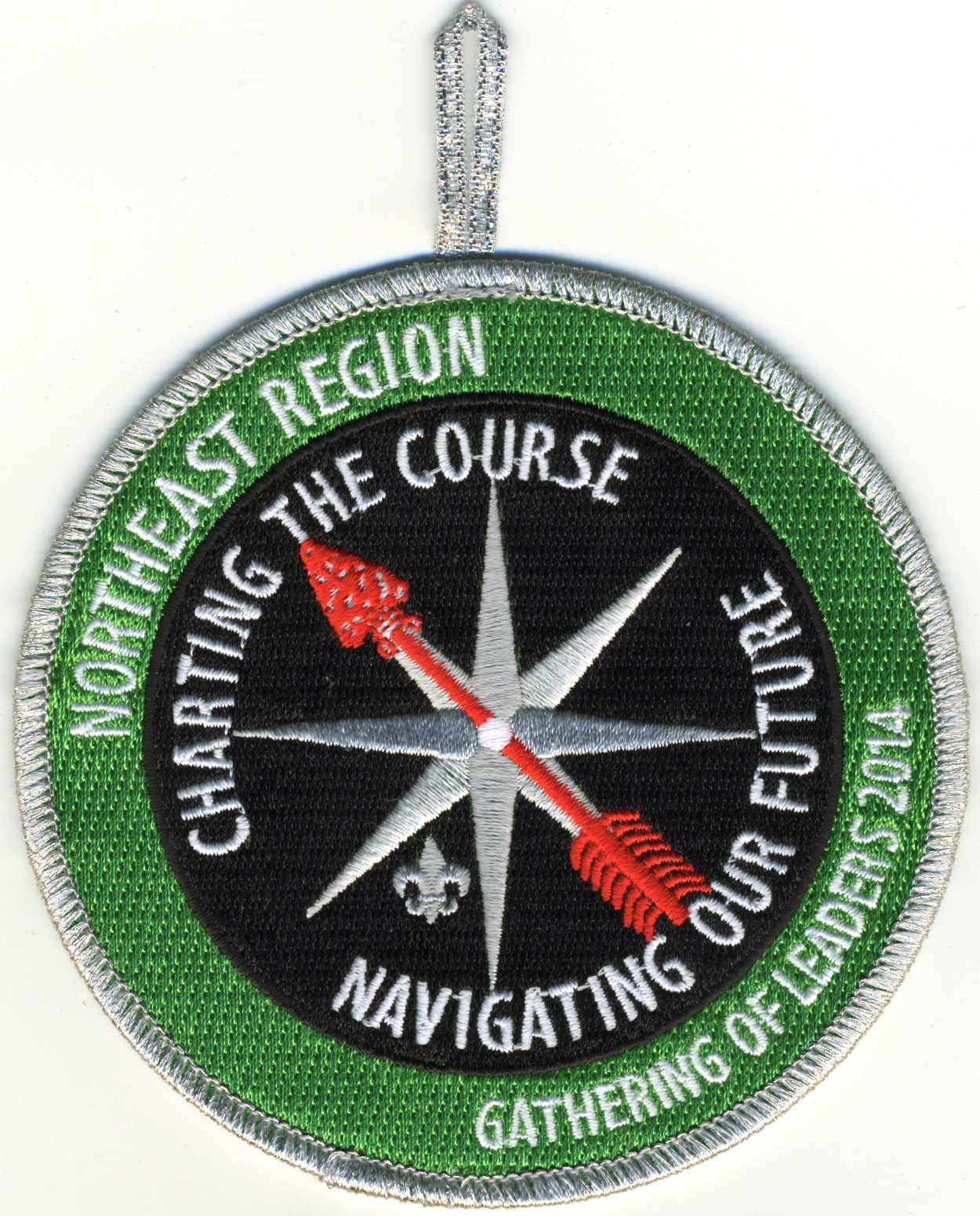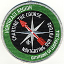 2014 Gathering of Leaders Staff | M/C | SMy | R | Wht | round | LGy | Compass rose; “Charting the Course”; “Navigating our Future”; button loop; staff issue |