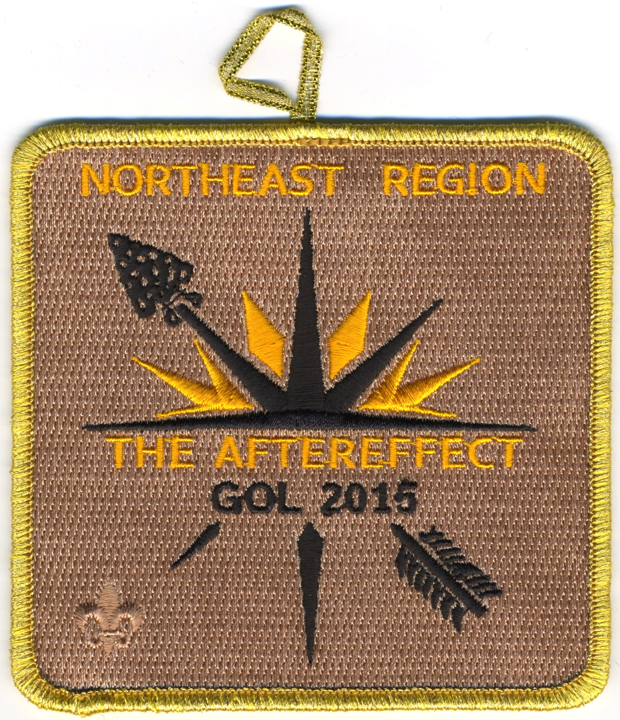 2015 Gathering of Leaders Staff | Tan | GMy | R | Org/Blk | square | Tan | Compass rose sunset; “The Aftereffect”; “GOL 2015”; button loop; staff issue |