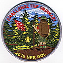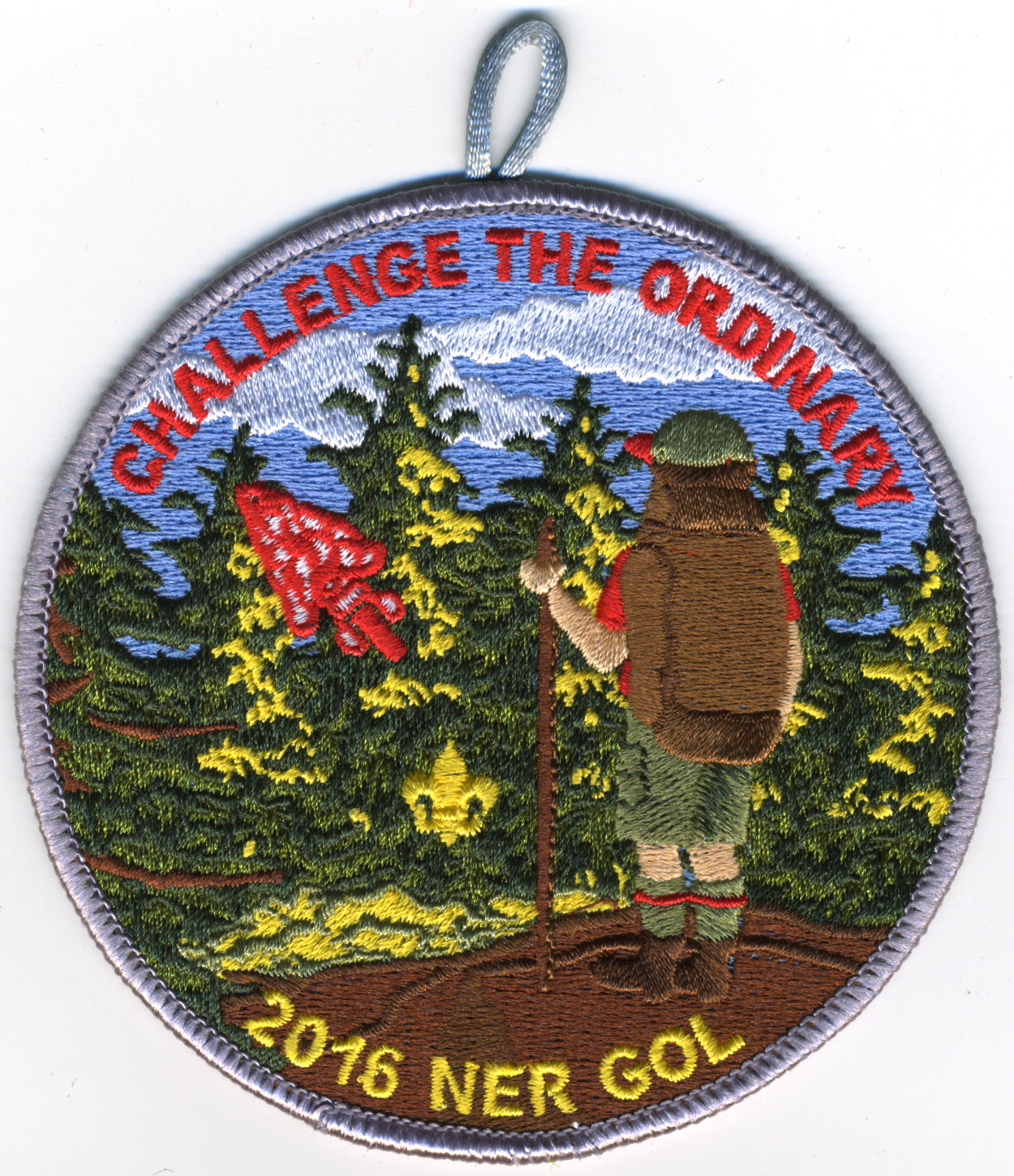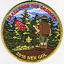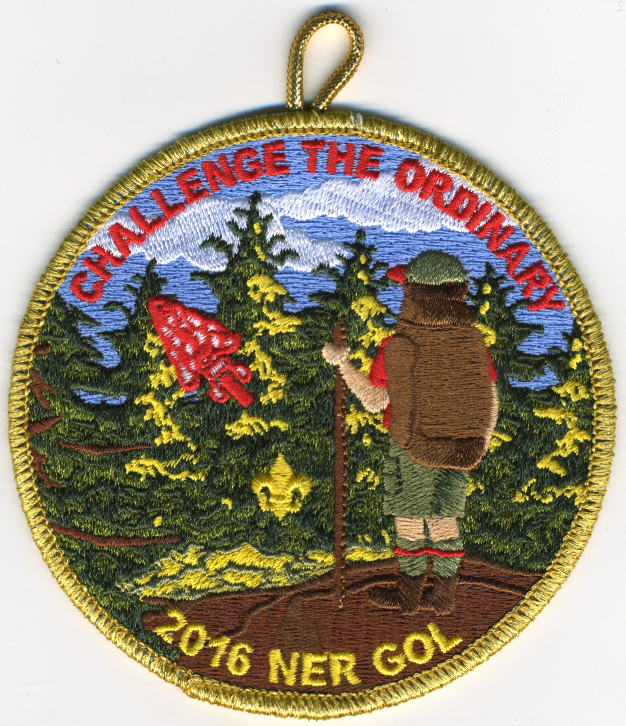 2016 Gathering of Leaders | M/C | Gry | R | Red/Yel | round | Yel | Hiker on overlook; “Challenge the Ordinary”; “2016 NER GOL”; button loop; participant issue |