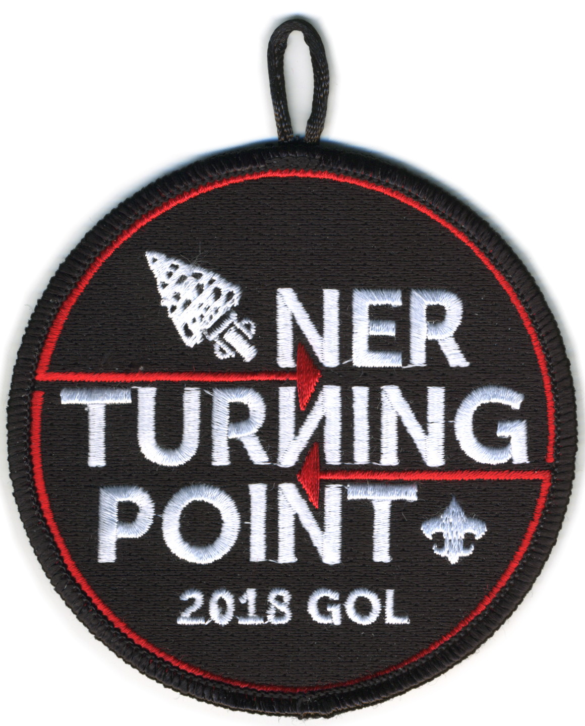 2018 Gathering of Leaders | Blk | Blk | R | Wht | round | Wht | White lettering and red highlight; “NER Turning Point”; “2018 GOL”; button loop; participant issue |