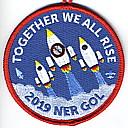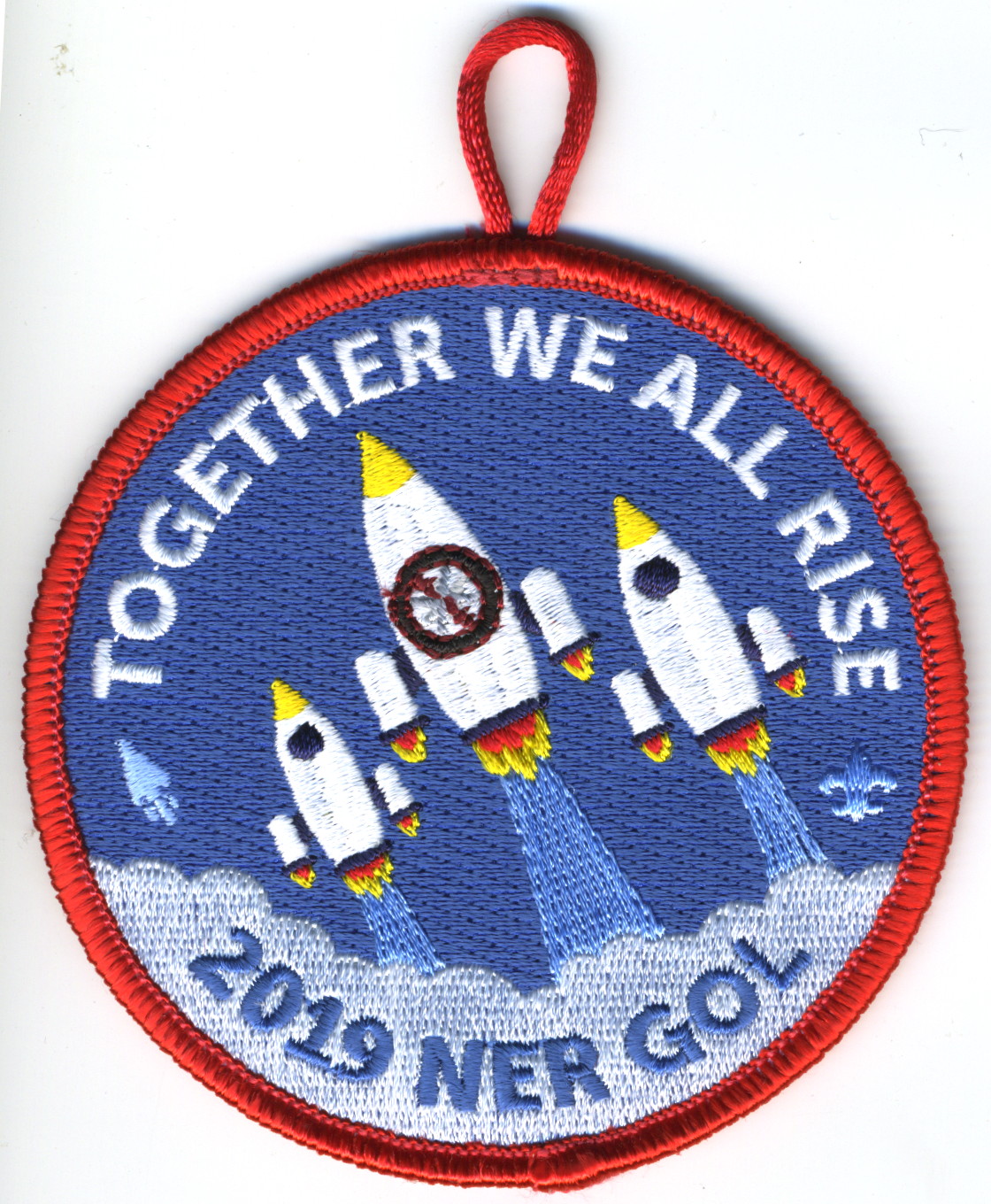 2019 Gathering of Leaders | Blu | Red | R | Wht/Blu | round | Blu | Three rockets; “Together We All Rise”; “2019 NER GOL”; button loop; participant issue |