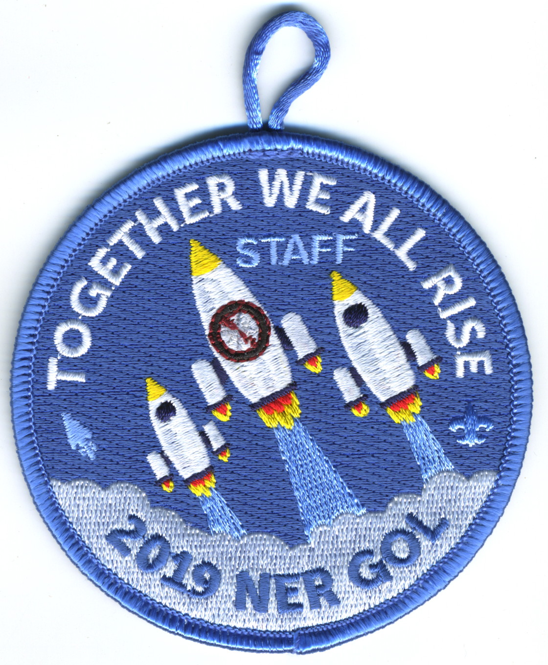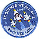 2019 Gathering of Leaders Staff | Blu | Blu | R | Wht/Blu | round | Blu | Three rockets; “Together We All Rise”; “2019 NER GOL”; blue “STAFF”; button loop; staff issue |