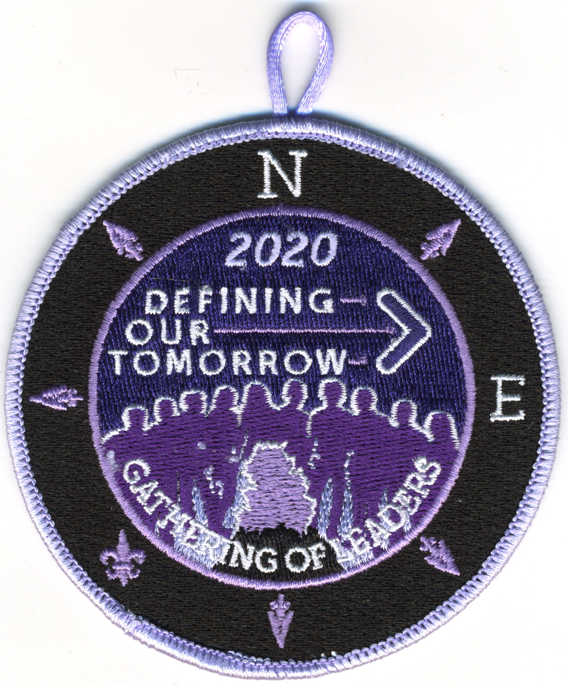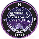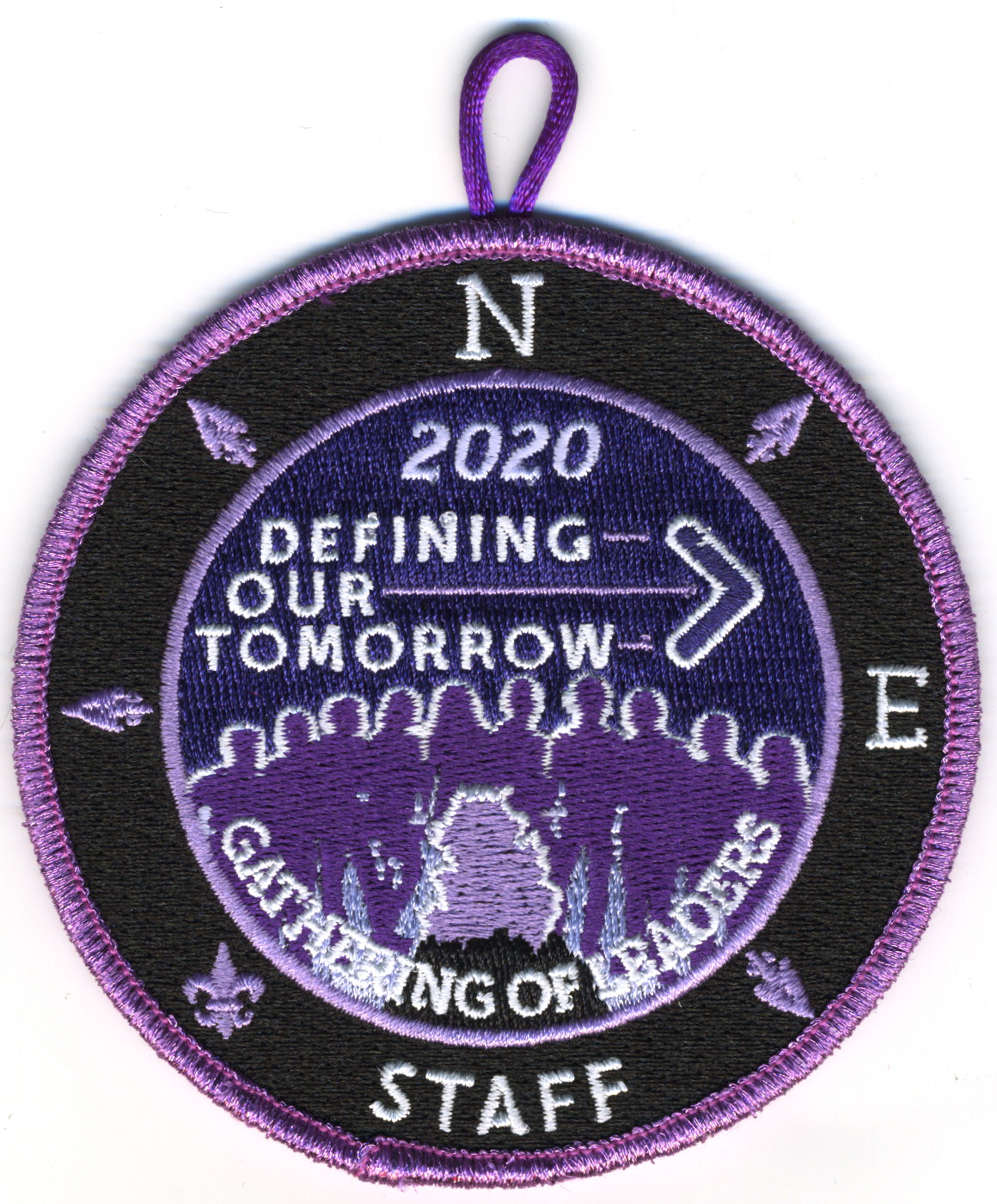 2020 Gathering of Leaders Staff | Blk | PurM | R | LVi/Wht | round | Lav | Silhouettes around fire; “Defining Our Tomorrow”; Wht “STAFF”; button loop; staff issue |