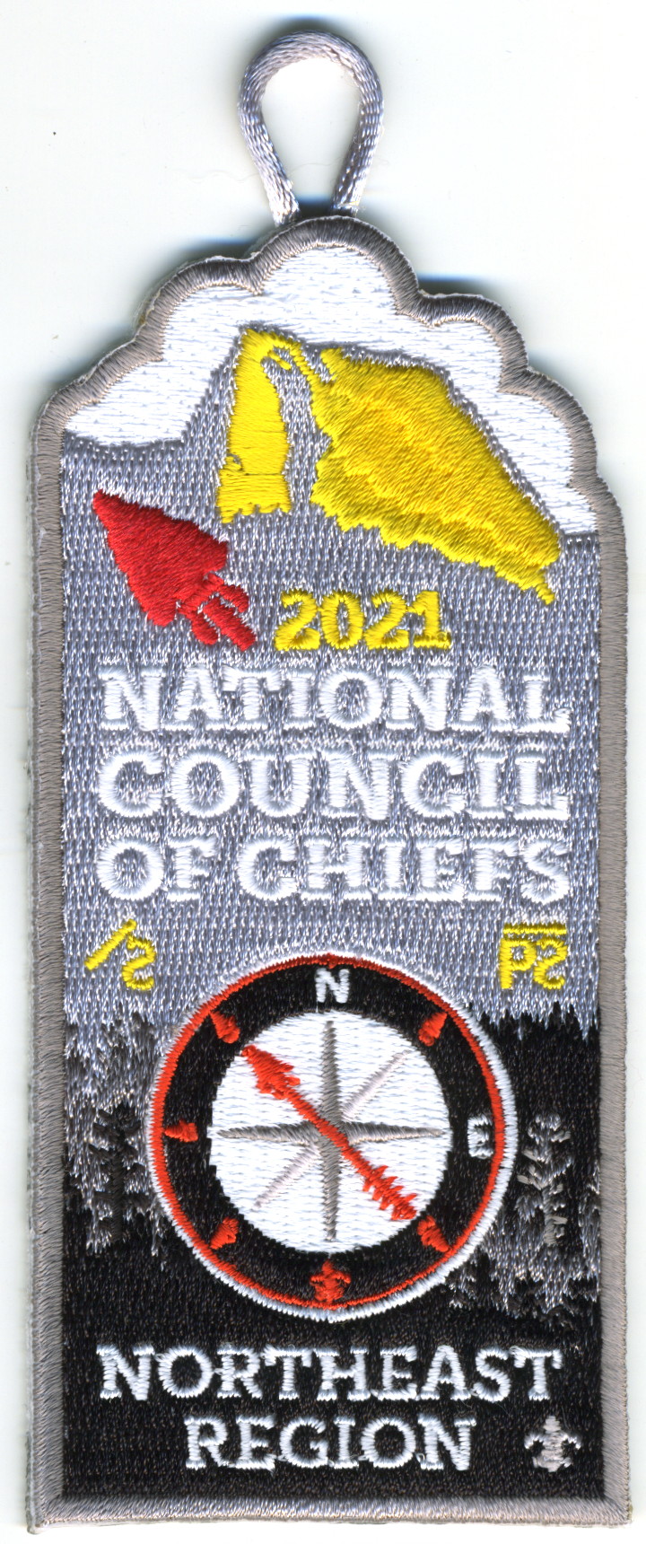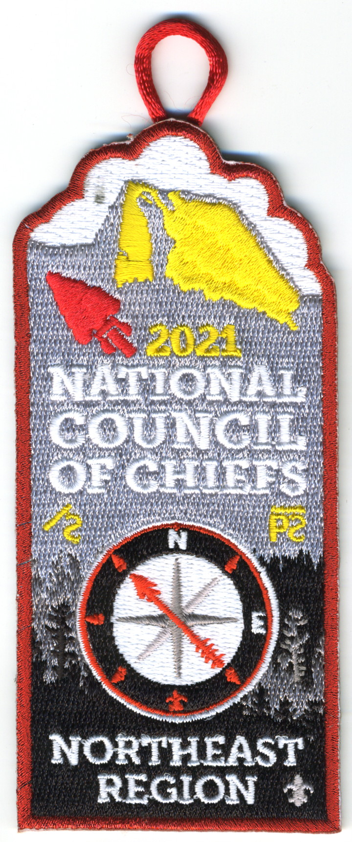 M/C | RMy | C | Wht/Yel | odd | Wht | Mountain and compass rose; “S2021 National Council of Chiefs”; button loop; gift/thank you patch |