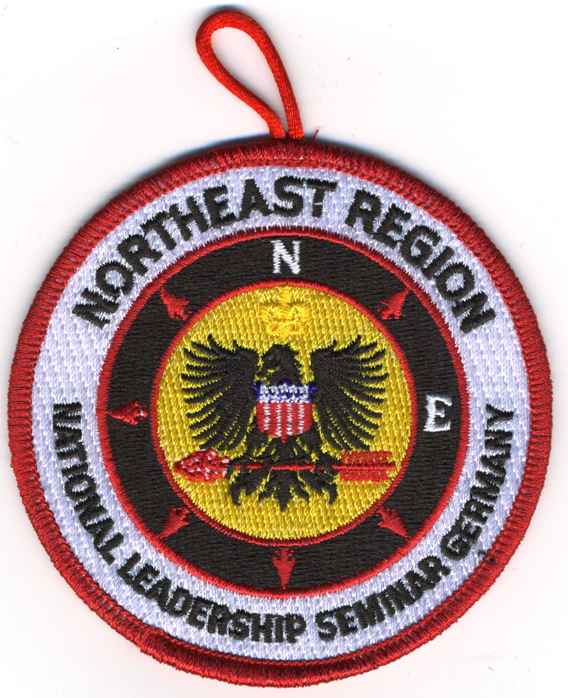 Wht | Red | R | Blk | round | Yel | Black Eagle on compass rose; “National Leadership Seminar Germany”; button loop; fundraiser patch; 2012 |