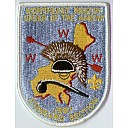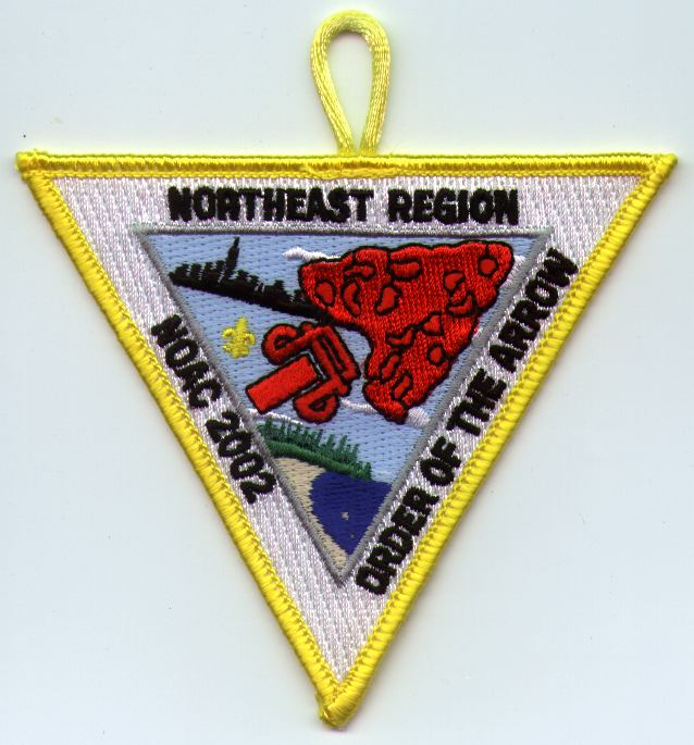 Wht | GMy | R | Blk | tri | Yel | Arrowhead and skyline; NOAC 2002; button loop; Region Chief’s issue |
