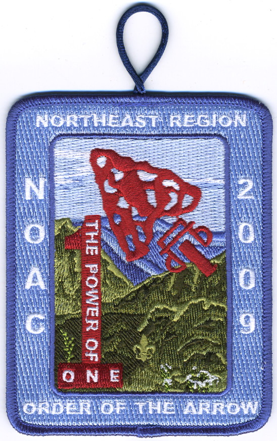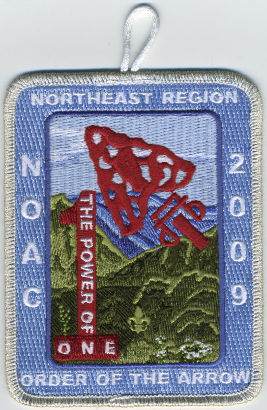 2009 NOAC | M/C | Blu | R | Wht | vrect | Olv | Mountains; “The Power of One”; NOAC 2009; button loop |