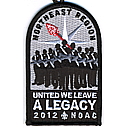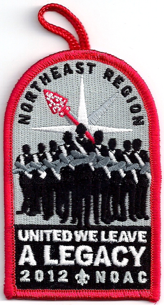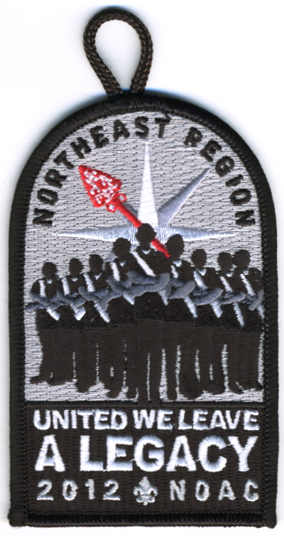 LGy | Blk | R | Blk/Wht | dome | Wht | Arrowmen with crossed arms; “United We Leave a Legacy”; NOAC 2012; button loop; given to Section and Lodge Chiefs |