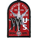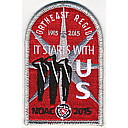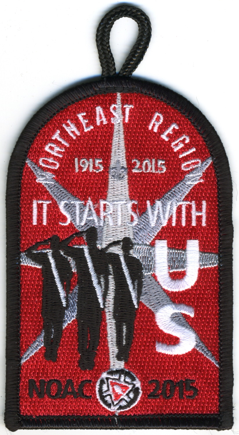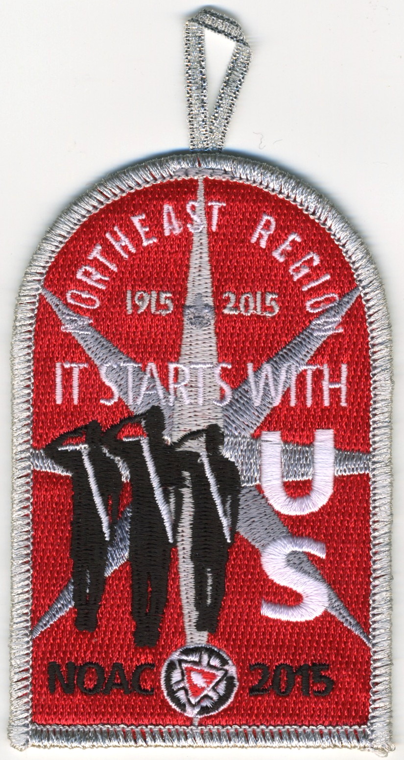 Red | SMy | R | Wht/Blk | dome | Gry | Arrowmen saluting; “It Starts With Us”; NOAC 2015; OA centennial totem; button loop; Region Chairman’s recognition patch |