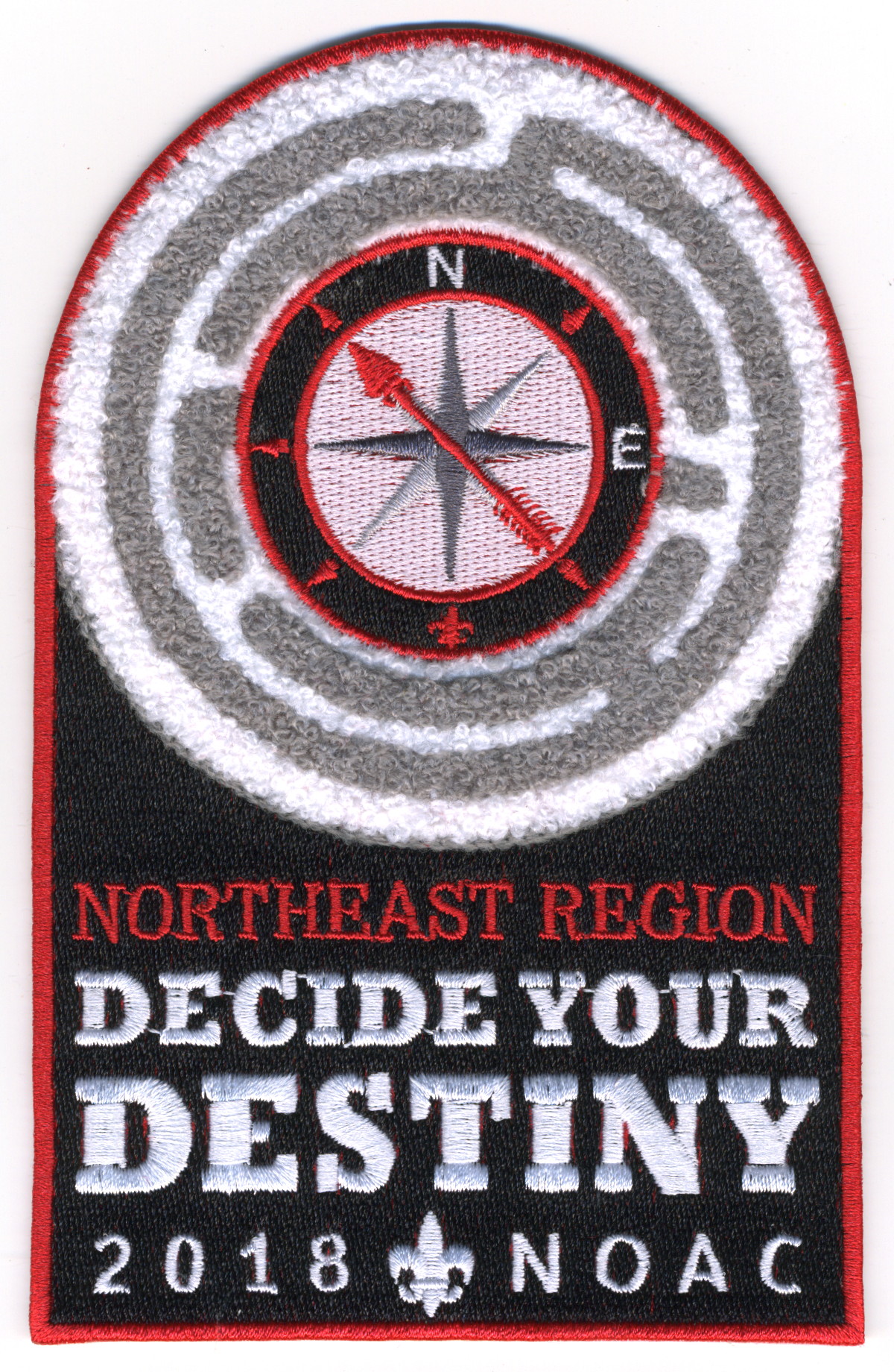 2018 NOAC | Blk | Red | C | Red/Wht | dome | Wht | Chenille; compass rose in maze; “Decide Your Destiny”; NOAC 2018 |