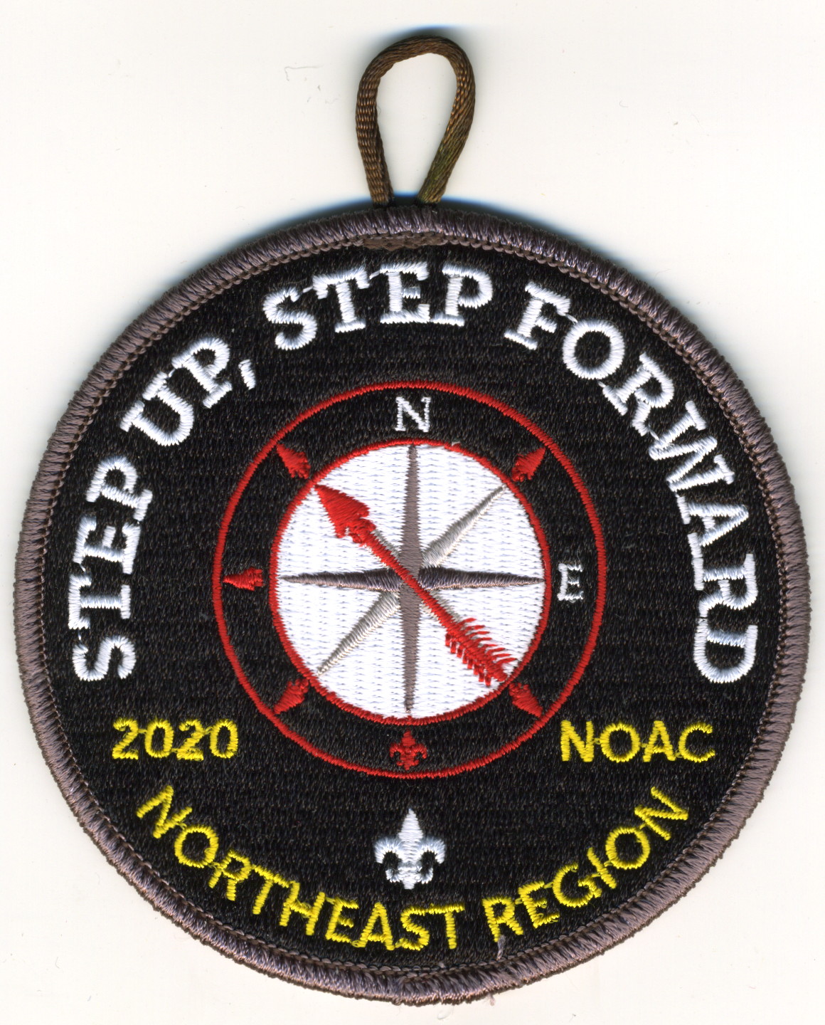 2020 NOAC | Blk | Brn | R | Wht/Yel | round | Wht | Compass rose; “Step Up, Step Forward”; NOAC 2020; button loop; event canceled |