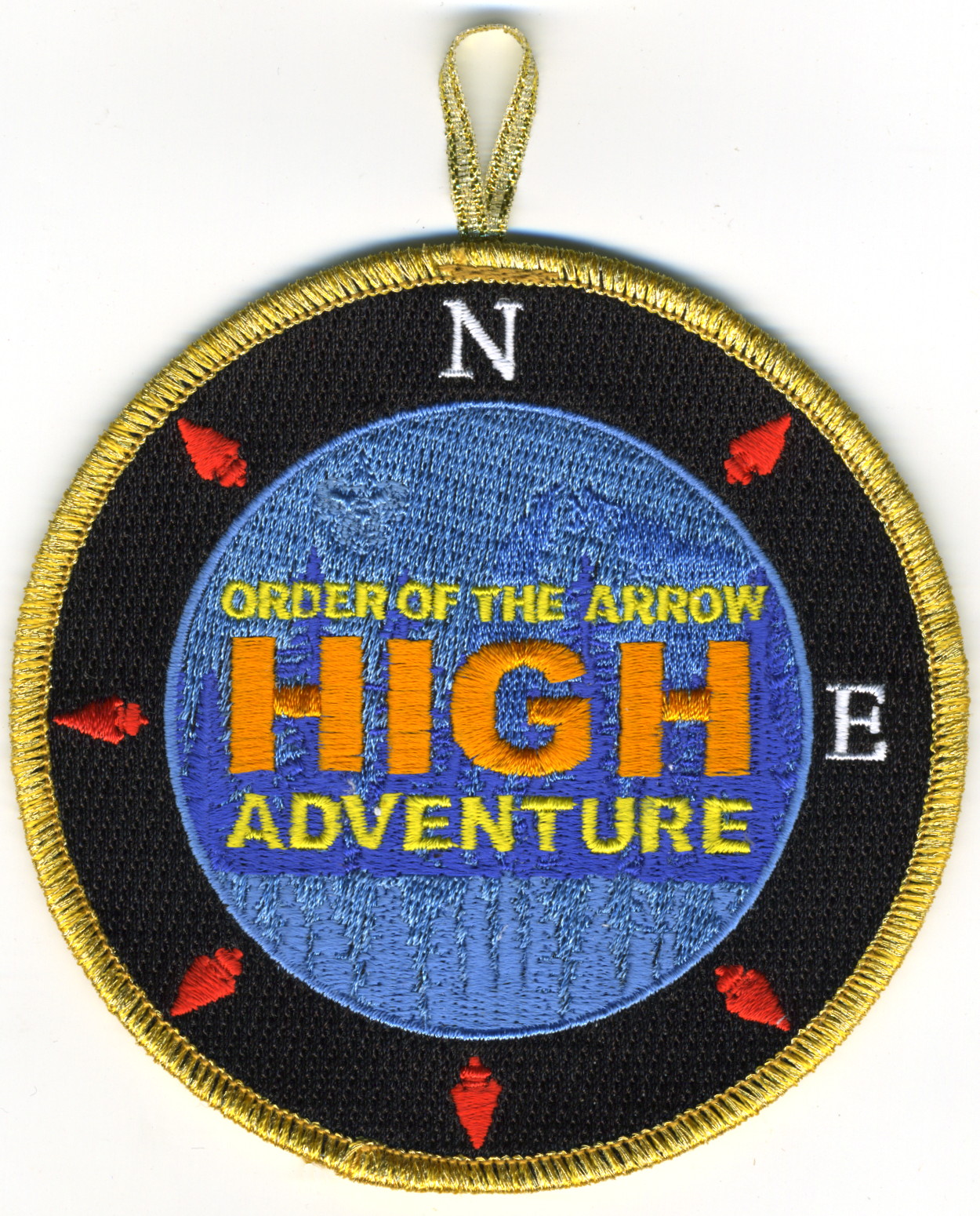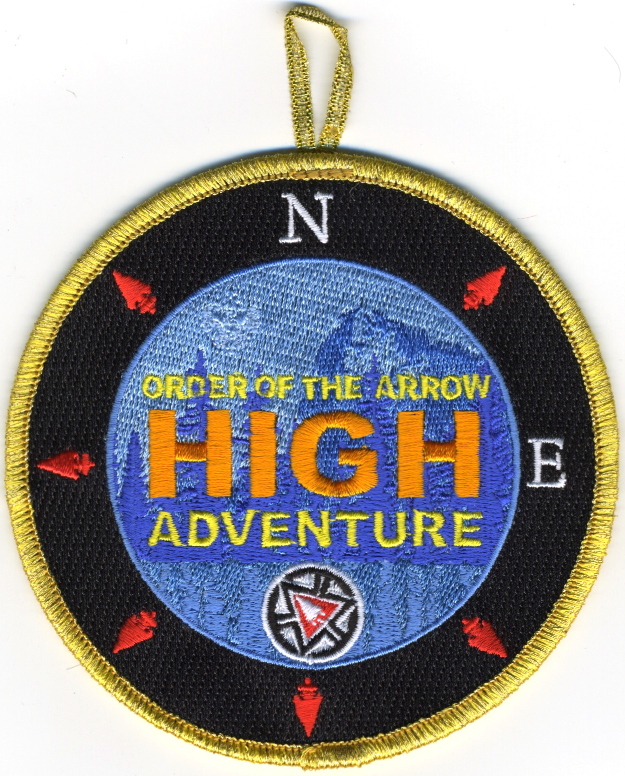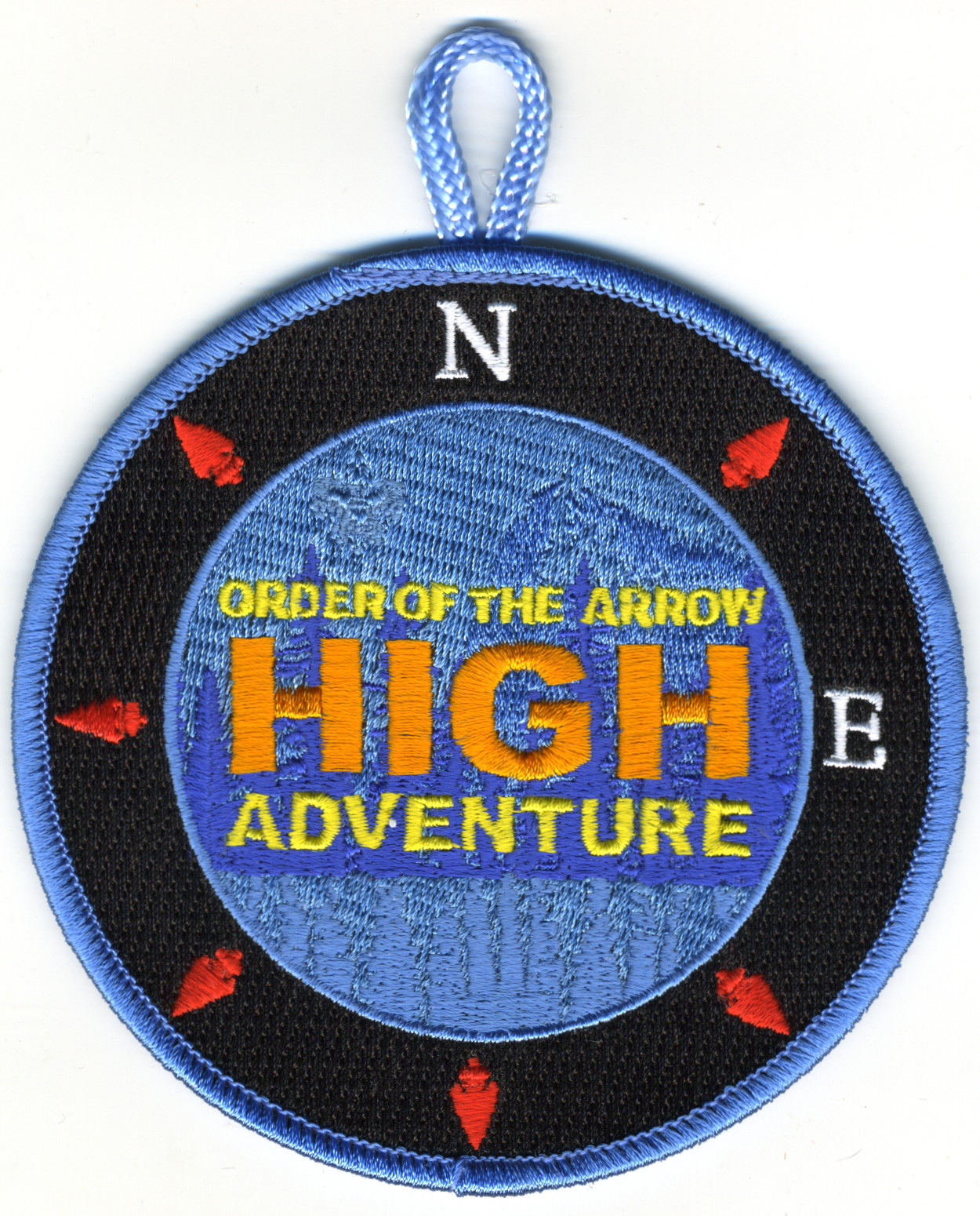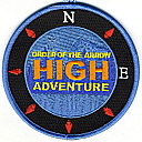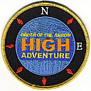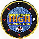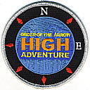 High Adventure | Blk | Blu | R | M/C | round | Blu | Compass rose; “Order of the Arrow High Adventure”; button loop; fundraiser patch; 2013 |