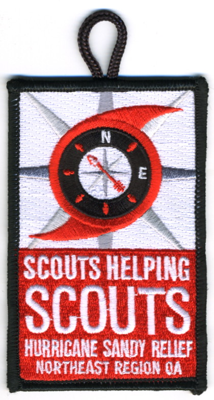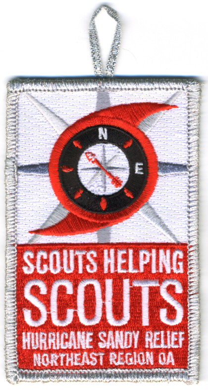 Wht | Blk | R | Wht | vrect | Wht | Hurricane and compass rose; “Scouts Helping Scouts”; “Hurricane Sandy Relief”; button loop; fundraiser patch; 2012 |