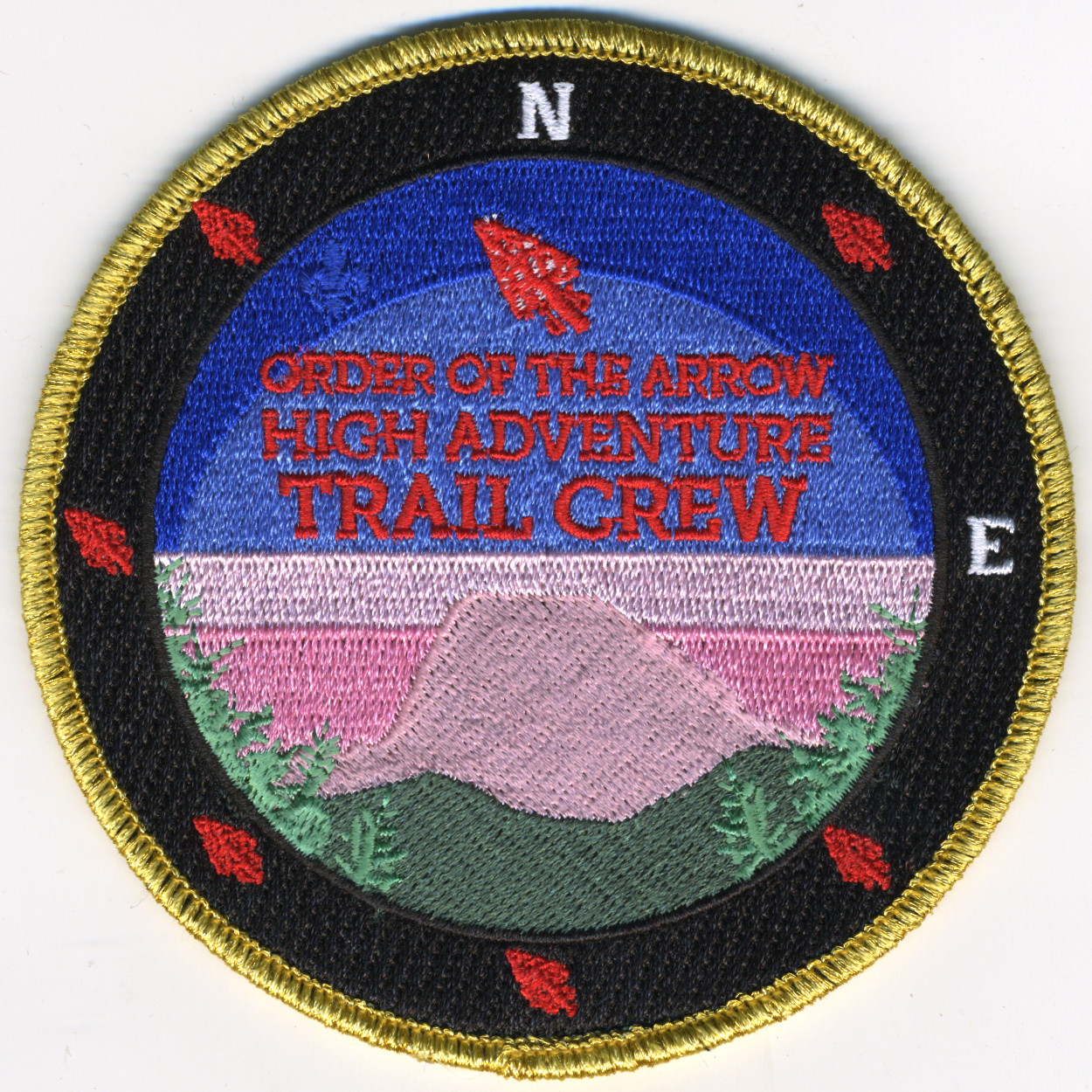 Blk | GMy | R | M/C | round | Blu | Compass rose; “Order of the Arrow High Adventure”; button loop; limited participant and limited fundraiser patch; 2013 and for 2014 participants |