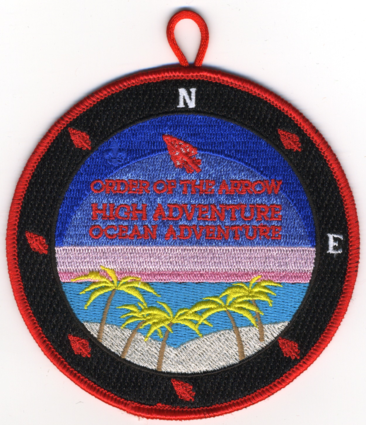 Blk | Red | R | Red/Wht | round | Blu | Palm trees; “Order of the Arrow High Adventure”; “Ocean Adventure”; button loop |