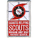 Wht | SMy | R | Wht | vrect | Wht | Hurricane and compass rose; “Scouts Helping Scouts”; “Hurricane Sandy Relief”; button loop; fundraiser patch; 2012 |